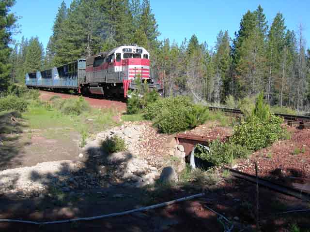 The #37 left the boxcars brought down from Car A at Bartle before continuing on towards Burney with the empty centerbeams. The train is seen here rounding the fill at the McCloud River crossing. This fill has been wiped out twice by flood waters in recent years, first in 1986 and then again in 1996. |
