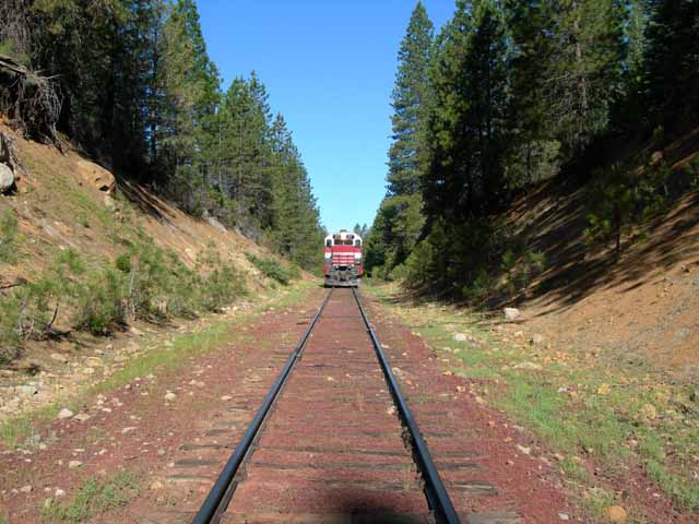 A few miles east of McCloud the railroad runs on a long tangent. The train is seen here at the end of that tangent. |