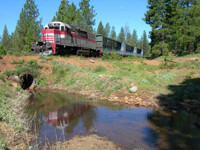 Less than a mile east of the Bartle tank the train arrives as the Bartle Wye, where the branch south to Burney leaves the original mainline to Car A. The #37 leaves the three centerbeams here and then heads up the Lookout Line to Car A to get the last four boxcars stored there. The culvert at wye created this little pond in the stream, allowing for this mirror image of the #37. |