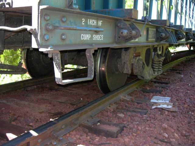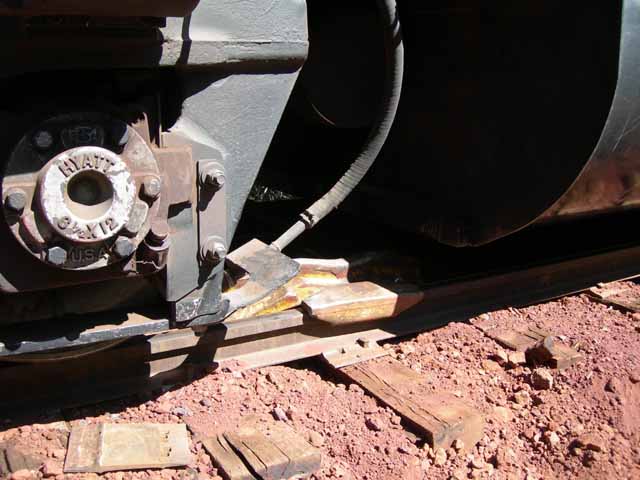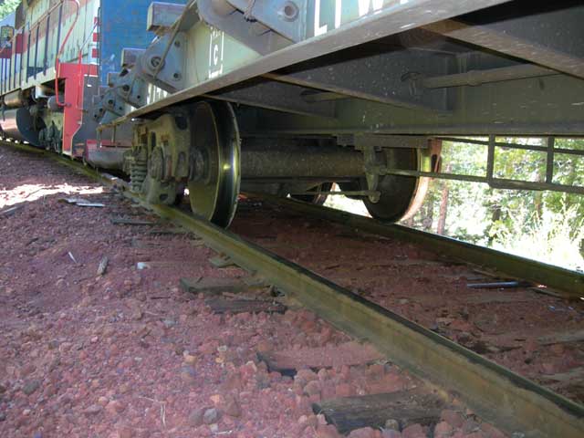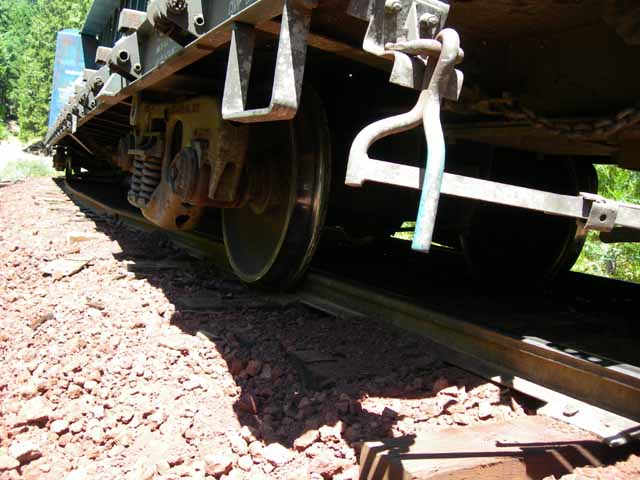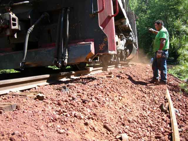 After an hour or so John and Jose, the two remaining guys on the section crew, arrived with the second rerailing frog. The three employees wasted no time in wrestling the frogs into place, one on each rail ahead of the rear truck of the locomotive. |
