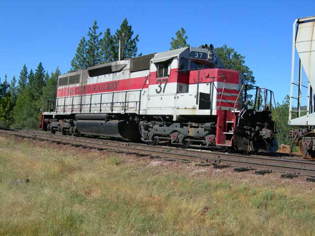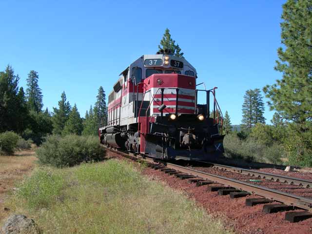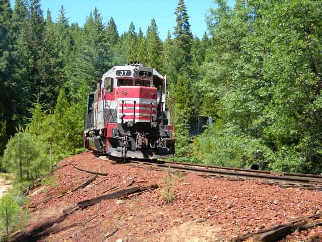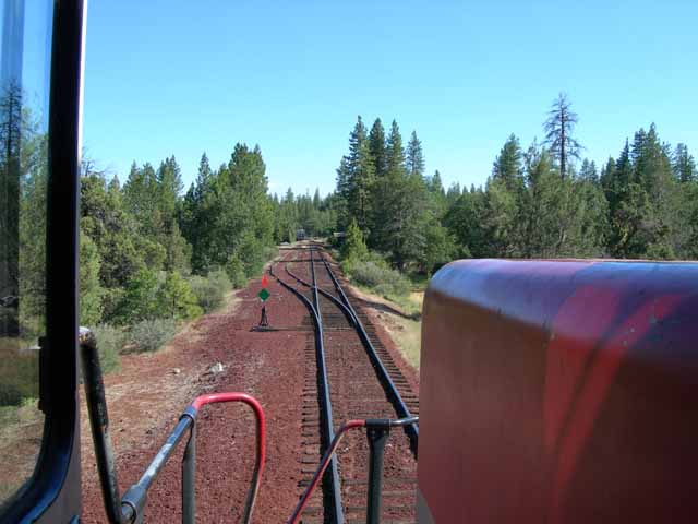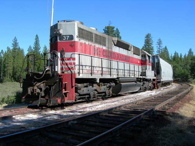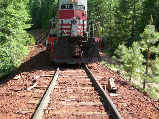 Once the crew had the #37 back on the rails they rolled the frogs out of the way and then discussed what to do next. They agreed that to pull the derailed centerbeam any farther forward would just tear up the tracks some more, and in the end they agreed to bring in a contract dozer the following morning to help re-rail the centerbeams. The #37 then departed light to Cayton while John and Jose headed back towards McCloud to make the necessary arrangements and gather the tools they would need the next morning. |