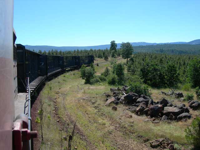 After an hour or so delay John and Jose appear, pick up a portable radio from Bob, and then take up their postions on the rear end to protect the reverse movement. The train starts the seven mile journey to the sawmill and it seen here passing through the area burned over by the Fountain Fire in August 1992. |