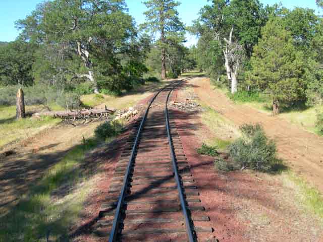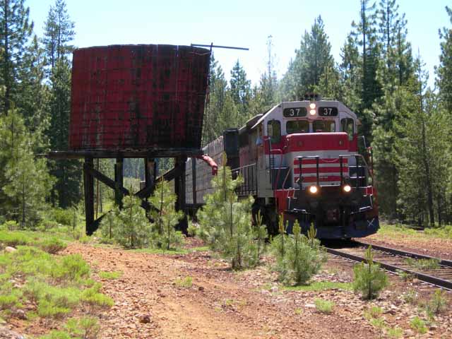 After adding the boxcars onto the rear of the train the #37 starts back west for McCloud, passing the Bartle tank again in the process. |