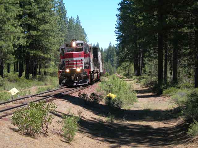 Rolling on the last few miles into McCloud. The train is approaching the Dry Creek Spur, which today is barely a carlength long. At one time the railroad had a small yard at this point, and the last railroad operations of the McCloud River Lumber Company went south from this spot to points deep in the mountains on the south side of the McCloud River. |