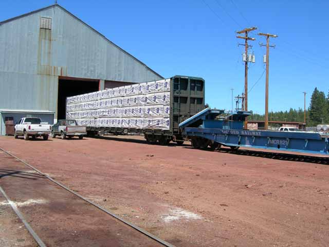 Once the load pulled from the shop has been added to the train brought from Burney the crew prepares to shove the #821 flat into the shop. Caltrans is in the middle of a major reworking of Highway 89 that will consume the next 4-5 years and involve major improvements over the entire stretch between McCloud and the junction with Highway 299 just east of Burney, and part of those improvements involve widening the roadway from two to four lands at the Lorenz crossing. A contractor will be delivering a new crossing guard setup tonight, which will be loaded onto the flat for transport to the job site. |