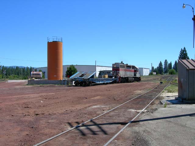 Back home again. The #37 rolls its ten car train into the two track makeup yard that runs along the east side of the shop building. The car on the left track is one of the loads damaged in the wreck back on 2 June, and it is waiting its turn to go into the shop for repairs before it can be shipped out. |