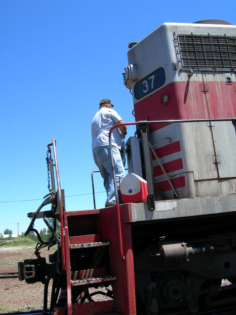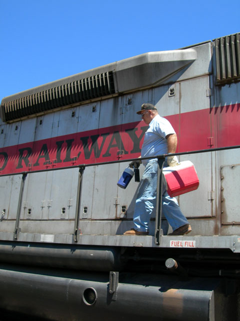Another day done. Bob has shut down and locked up the locomotive and is seen here walking down the walkway towards the back of the locomotive. |