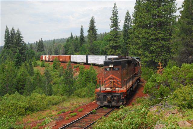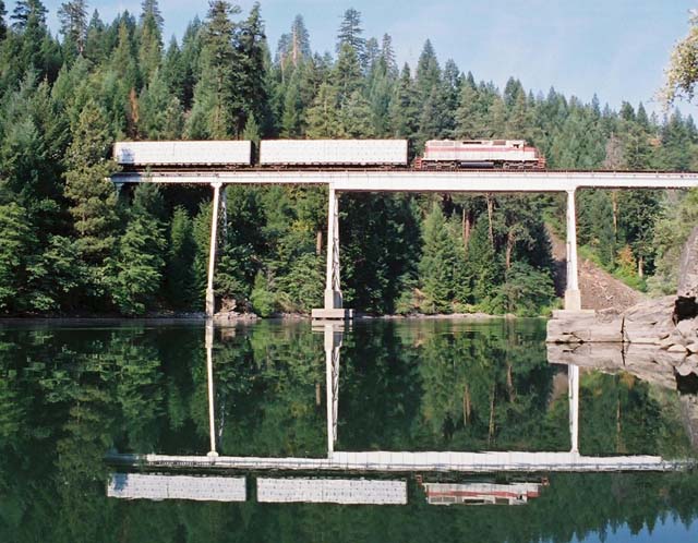 The #37 leading the three loaded and two empty cars across the Lake Britton bridge. David Joslin photo, used with permission. |