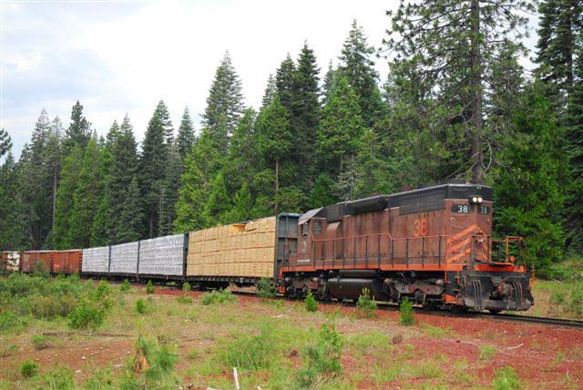 Thursday morning started with the #38 moving the rest of the boxcars brought from Pondosa on Tuesday up to the siding at Pierce, the summit between McCloud and Mount Shasta. The #38 then ran light engine straight through to Lorenz, where the locomotive coupled onto the #821 flat and called it a day. |