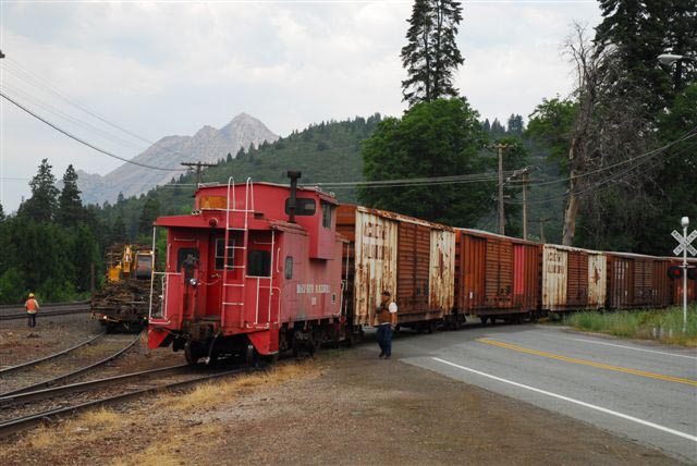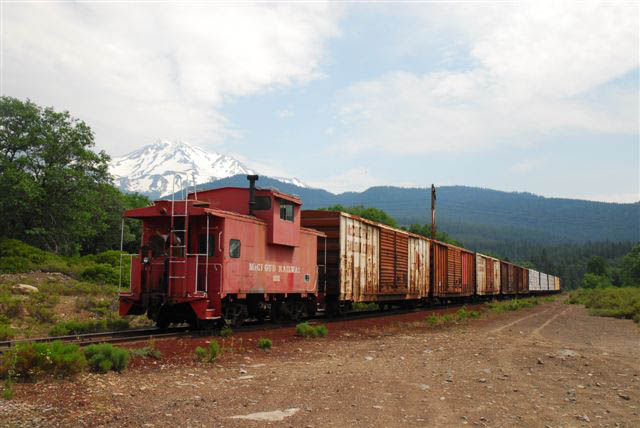 The train crew came to work Wednesday morning with a Yard & Hill job marked up on the boards. The shop crew had fixed and released another one of the loads damaged in the 2 June wreck, and the train crew added that to the three loads brought in the day before. The crew then set one of the boxcars and the two bad ordered centerbeams out in the yard before adding caboose #102 and heading for the hill with four loads and five empty boxcars. However, only one of the four sanders on the #37 proved to be working, and the train crew quickly found themselves back in McCloud looking for another locomotive. A number of problems cropped up with the #38, which the employees quickly repaired or patched together as best they could. Once the #38 was up and running it made the trip up and over to Mount Shasta City, where the crew discovered another problem in the form of a lot of Union Pacific maintenance-of-way equipment blocking the McCloud's access to the yard. The McCloud got ahold of the right people, and before long the UP crews moved the offending pieces of equipment. The McCloud then set out the train they brought in before returning to McCloud with the caboose only. |
