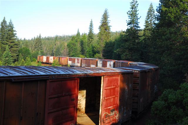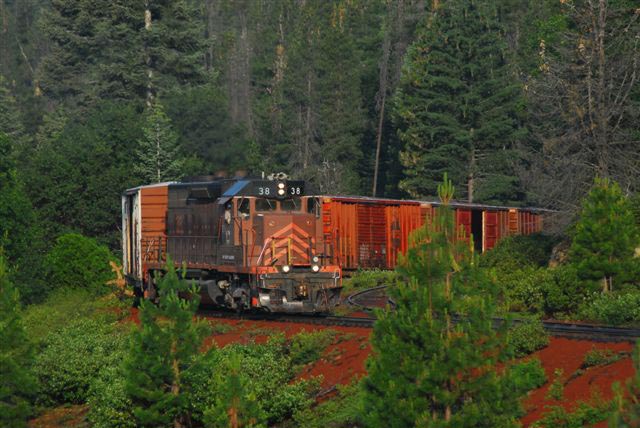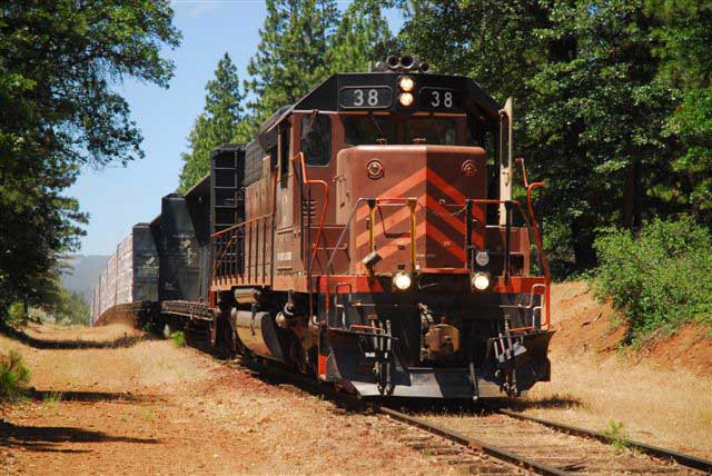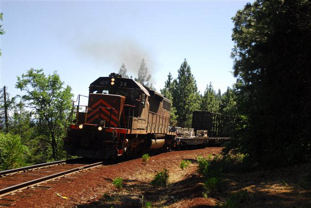 Does it all come down to this? #38 leading the five cars that Sierra Pacific did load plus the two they did not through the Fountain Fire area a little over two miles away from the mill. Drew Jacksich photo, used with permission. |