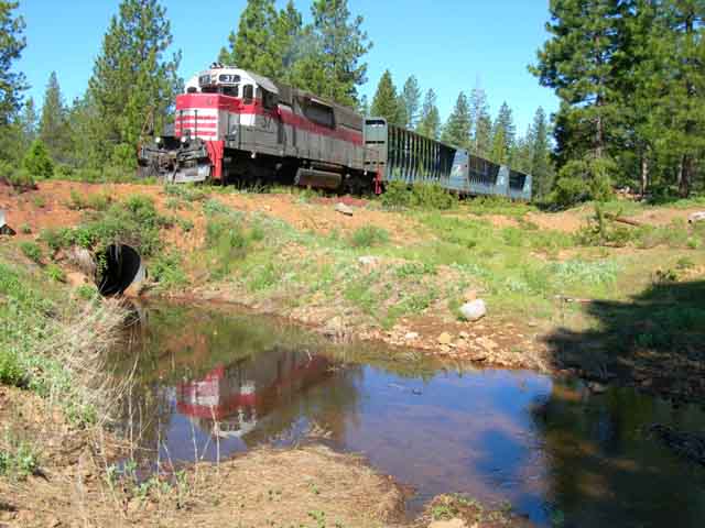 The day started out with the #37 bringing three empty centerbeams from McCloud to the Bartle Wye, where the cars would be left on the main line while the locomotive proceeded up to Car A to get the boxcars. A small stream provided a nice reflection of the locomotive. |