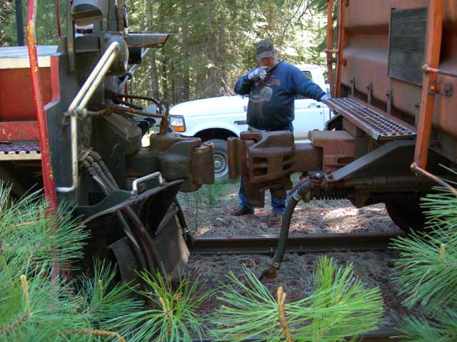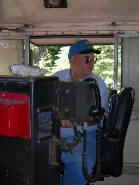 McCloud Railway employee Keith Jones met the #37 at Car A to help with the coupling and air testing the boxcars. Here he is giving Bob switching instructions over the radio. |