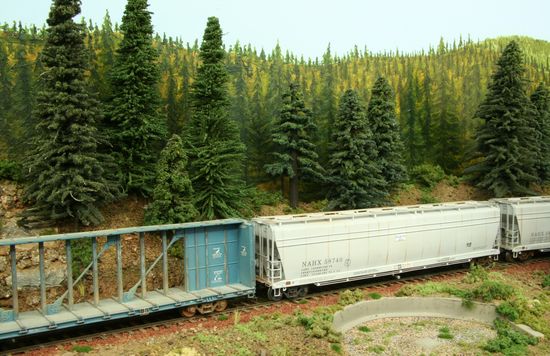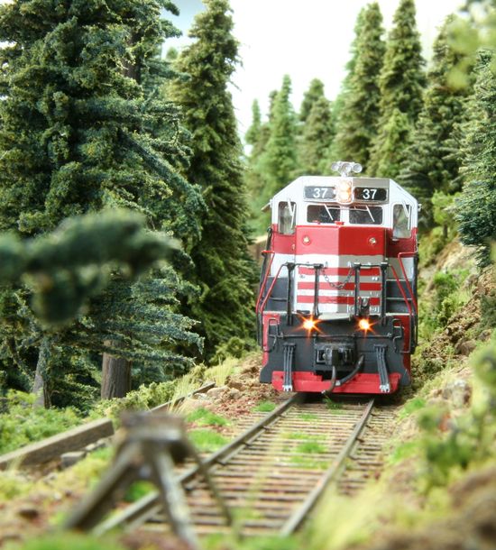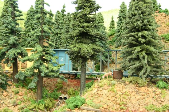 Some deer grazing near the tracks as a train rolls through the trees. Lee has done a good job replicating the many fills found on this railroad. |