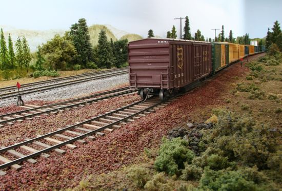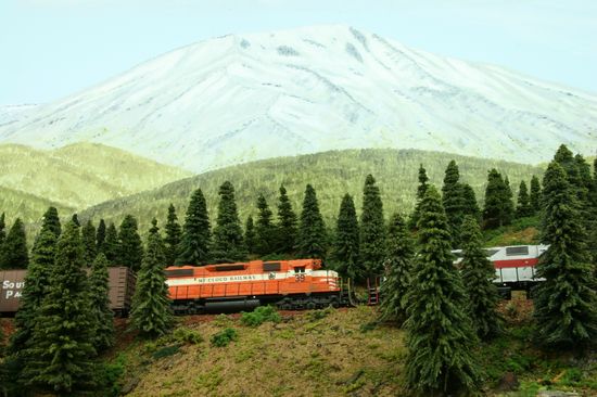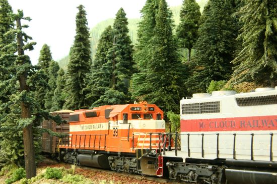 We'll start our tour of Lee's layout in Mount Shasta City, where a string of empties are seen waiting for the McCloud Railway on the interchange track. |