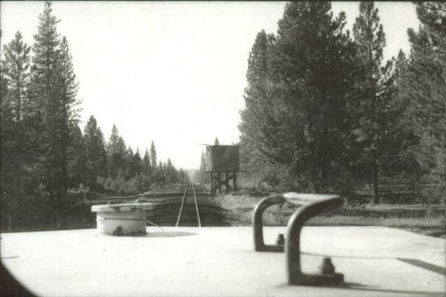 Looking forward from the cab of the #37 as the train pushes the ballast hoppers and loader somewhere between Hambone and Porcupine. |