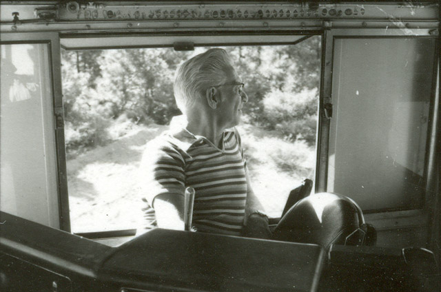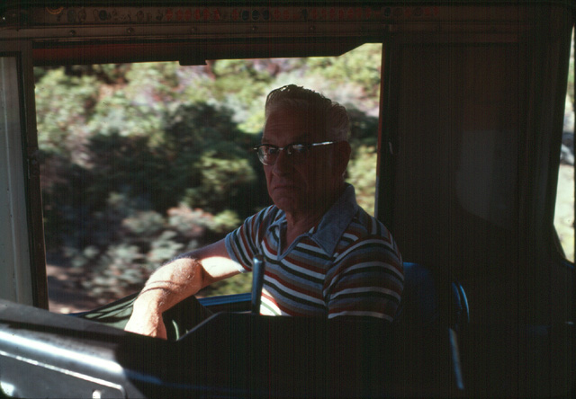 Another shot of Ray at the controls of the #37. Note that the cab roof above the engineer's seat is filled with fruit stickers. Ray added one on every trip he made, and woe be it to any other engineers that tried to add to- or remove any of- Ray's sticker collection. |