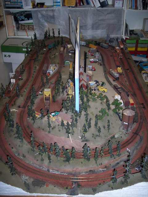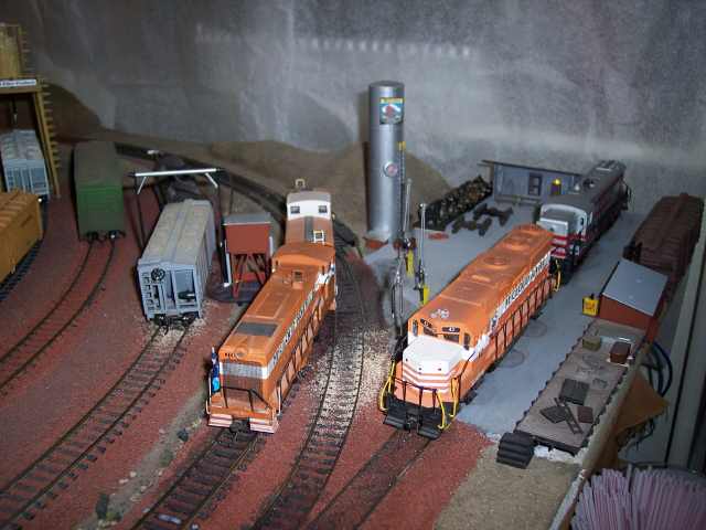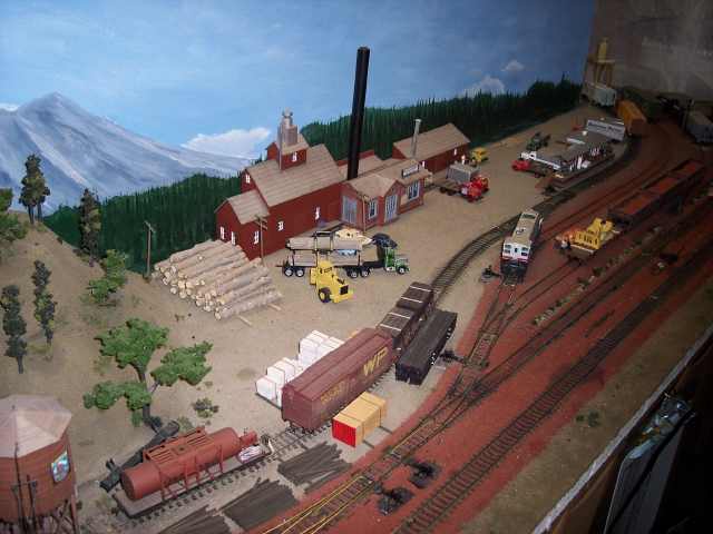 An overview of the McCloud yard and sawmill. Hooper tank is just visible in the lower left corner, with a fire car on the track next to it. The ballast train is spotted on one of the yard tracks. |