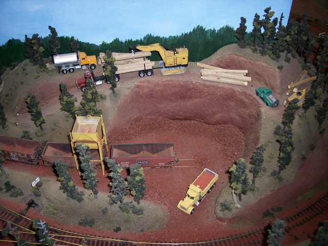 An overview of the ballast pit, with a logging operation taking place in the hills behind the quarry. The ballast cars have been spotted to receive another load. |
