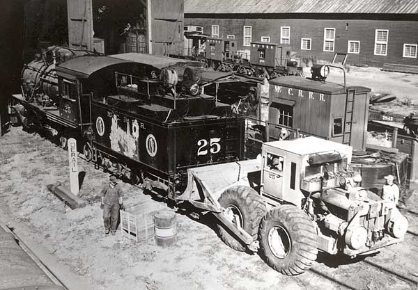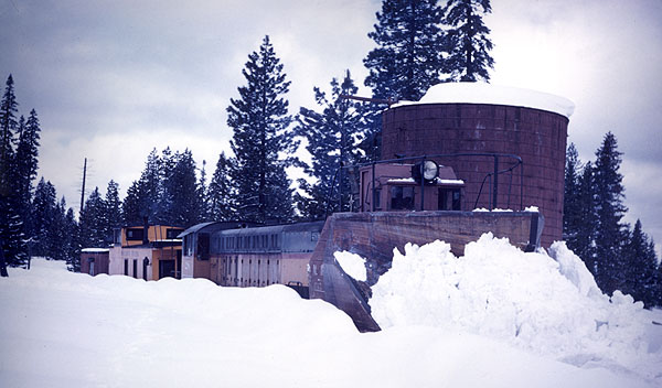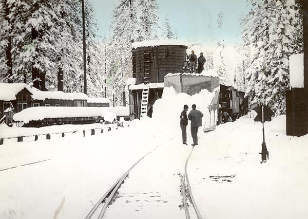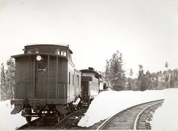 Some of the tools the McCloud used to clear snow from the rails are visible in this photo. One of the small box plow/flangers is on the track adjacent to the #25, and two flangers are visible in the background. The #25 has just returned from the Burney opening line celebrations. Travis Berryman collection. |