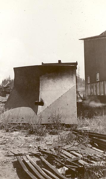 A steel wedge plow behind the McCloud roundhouse in June 1936. Travis Berryman collection. |