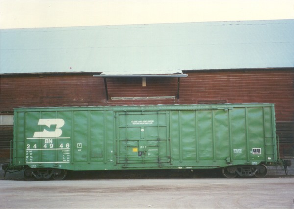 A Burlington Nothern boxcar spotted next to the warehouse for unloading. |