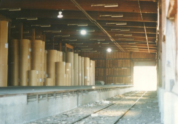 A peak inside the building reveals many rolls of paper waiting shipment south to Reno. |