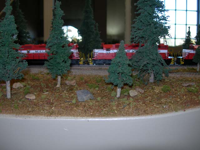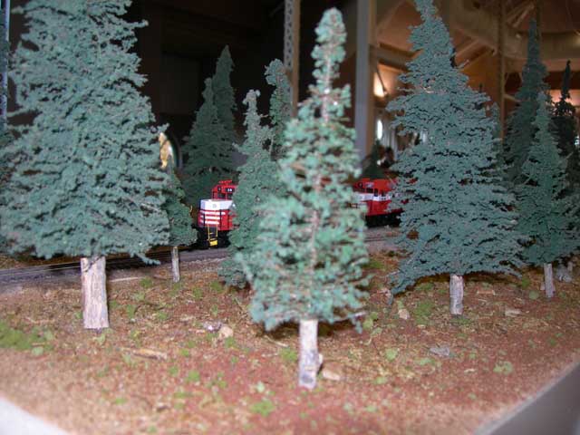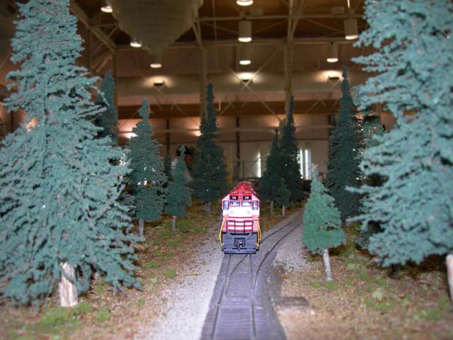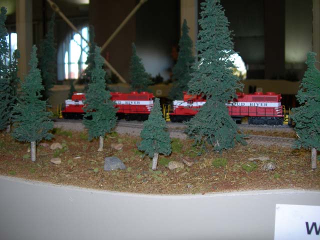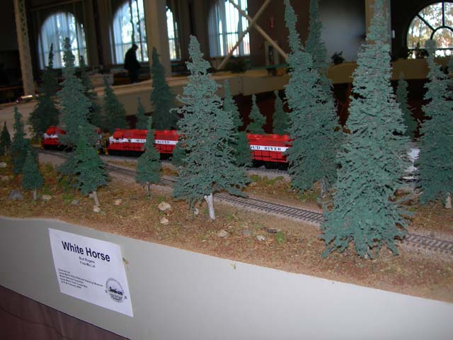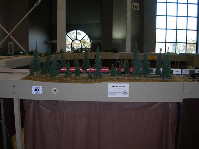 Bud Rogers of the greater Los Angeles area has built a module based on White Horse. His module travels around to various events in the western United States. These photos feature a trio of Athearn's McCloud River SD38's posed on Bud's module at the Wasatch Rails show in Salt Lake City, Utah, in November 2007. All photos by Jeff Moore. Bud hopes to build a second McCloud based module in the future, to be based on Lookout Junction. |