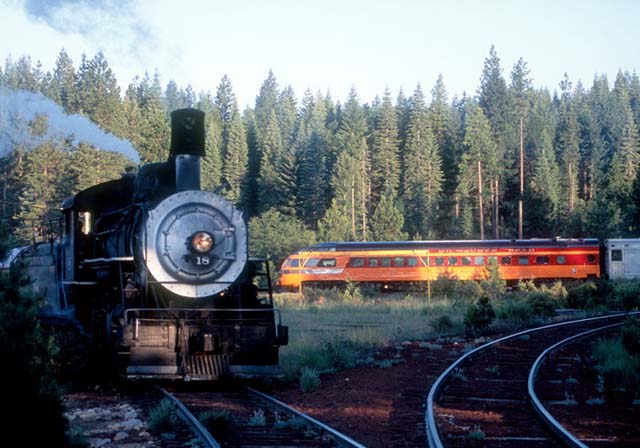 The #18 sitting on the Burney leg of the wye at the upper end of the McCloud yard as the first section of the Trains Unlimited special leaves town in the background. John West photo |