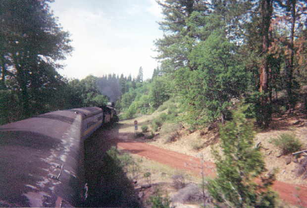 (Picture 131) Near Lake Britton, CA, 5/2003. The #18 and the two VIA coaches taken from the top deck of the double-deck flatcar. |