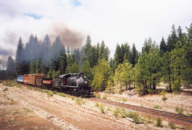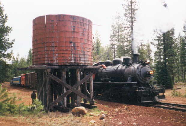 (Picture #129) Bartle, CA, 5/1998. After turning on the Bartle Wye, the #25 heads westward past the Bartle Tank on the return trip to McCloud. Photo by Alicia Moore. |