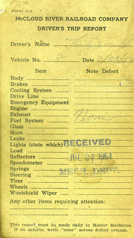 the plaintiff bus line, but that didn't stop the former owners from continuing litigation against the railroad for several more years. Despite the legal problems, the buses proved very successful. On 1 september 1929 the railroad sold the three buses and the garage the company built on the east side of the McCloud yard to house and mainain them to the McCloud Transportation Company, a subsidiary of the railroad. McCloud Transportation Company handled the bus service until February 1937, when the railroad dissolved the subsidiary and repurchased the bus assetts. The buses continued providing two round trips a day, with a third trip added on Sundays during some periods of time, for the next several decades. By the early 1960s passenger counts dwindled to nearly nothing, and more days than not the company only ran the bus to handle the railroad's mail contract. However, the post office cancelled that contract on 25 April 1964, and the railroad promptly cut service from twice daily to once a week. The railroad applied to the California Public Utility Commission for permission to suspend the service, stating in its application the company had only earned $239 in gross passenger revenues in 1963 and had carried only 97 passengers generating $44.45 in revenue in the the first three months of 1964. The Commission issued an order allowing the railroad to cease the passenger operations on 14 July 1964, and the last buses ran shortly thereafter. All Time Bus Roster Bus 1- White, purchased 4/1927. Cost $6,376.70. Sold 9/1/1929 to McCloud Transportation Company; repurchased 2/1937. Retired 5/1937. Bus 2- White, purchased 7/1927. Cost $4,420.60. Sold 9/1/1929 to McCloud Transportation Company; repurchased 2/1937. Retired 8/1938. Bus 3- Studebaker, purchased 1/1928. Cost $900. Sold 9/1/1929 to McCloud Transportation Company. Retired prior to 1937. Bus 4- GMC panel bus, 6-cylinder, 6-wheel, purchased 6/1937. Cost $1,278.12. Retired 1946. Bus 5- GMC suburban carryall, 6-cylinder, 4-wheel, purchased 6/1937. Cost $1,058.66. Bus 6- Ford panel bus, purchased 4/1941. Cost $1144.70. Retired 1951. Bus 7- Studebaker 13-passenger bus, purchased 8/1946 from Gilling Brothers. Cost $5,161.66. Retired 1953. Bus 8- Wayne-GMC bus. Purchased 10/1953 from Crown Body & Coach Corp. Bus 9(?)- 1960 Wayne-GMC bus. Ordered new 3/22/1960. 133" wheel base, GMC chassis, 4-speed synchromesh transmission, 150-h.p. Y6 engine, heavy duty cooling, heavy duty fan, heavy duty generator, vacuum reserve tank, six 5.22-5 10-ply tubeless tires, 12-volt electrical system, engine vacuum gauge, spare tire carrier and spare wheel, Wayne model SC01406 Super Custom Body with two rows of 39" seats, heavy duty 42-oz. upholstery, body length 14'6", to have center rear emergency exit, 6"x16" exterior mirrors, Solex tinted windshield, 80,000 b.t.u. front heater and defroster, 2 red reflectors, extra tail lights, self canceling extra large stop lights, aluminum seat backs, drive shaft guard, fog lights, two 1-qt. fire extinguishers, all railroad crossing signs, 24 mounted first aid kits, rear door buzzer and telltale dash light. Net price f.o.b. Richmond, Indiana- $4,406.71. Optional equipment- one set flags/flares ($3), one 5-lb. dry chemical fire extinguisher ($8.50), 5" white lettering at $0.40 per letter, and electric windshield wipers at $27.56. |