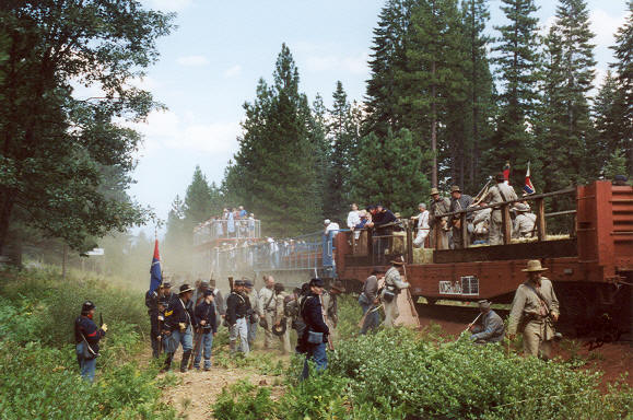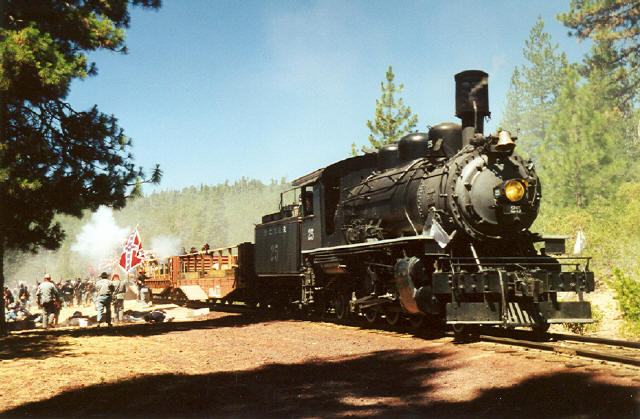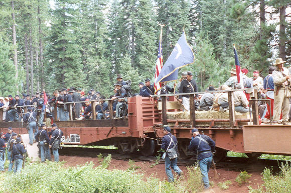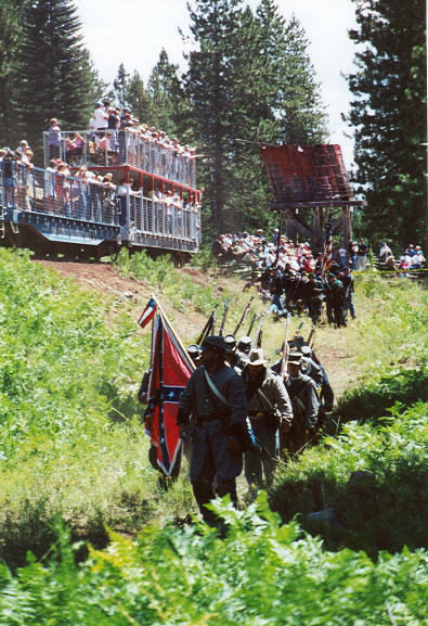 Civil War Trains McCloud became home to an annual Civil War Re-enactment around 2000. This has become a popular yearly event in McCloud. The events include battles between Union and Confederate soldiers for control of the town. The railroad runs passenger specials up the hill, carrying both troops from one side or the other and paying passengers. The train is ambushed somewhere along the line by the other side, the train is captured, and the victors ride the train back down to McCloud, only to lose the train again on the next trip. All photos by and courtesy of Roger Titus. |