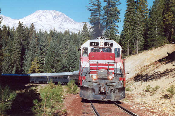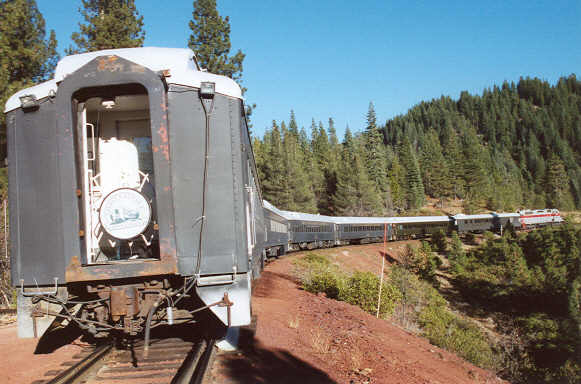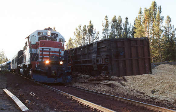 The #37 leads the dinner train though a slow order 12 miles east of McCloud. Two loaded woodchip cars derailed at this spot, and they have not yet been set back on the rails. Roger Titus photo. |