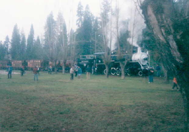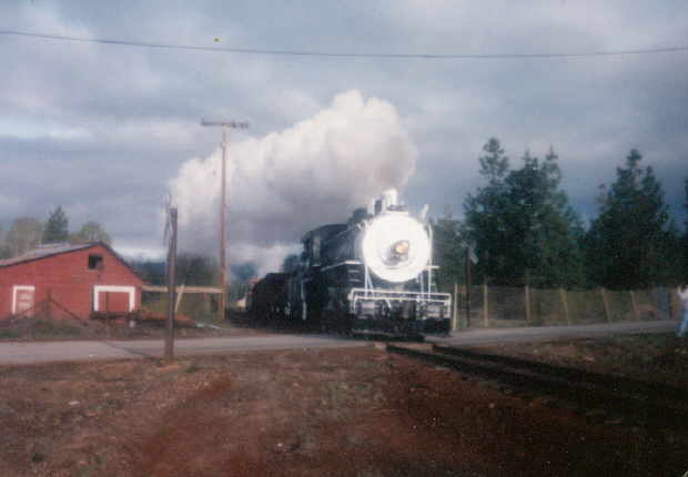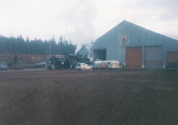 (Picture #110) McCloud, CA, 4/1994. The #19 is seen here finishing it’s fire-up in front of the McCloud shop building. |