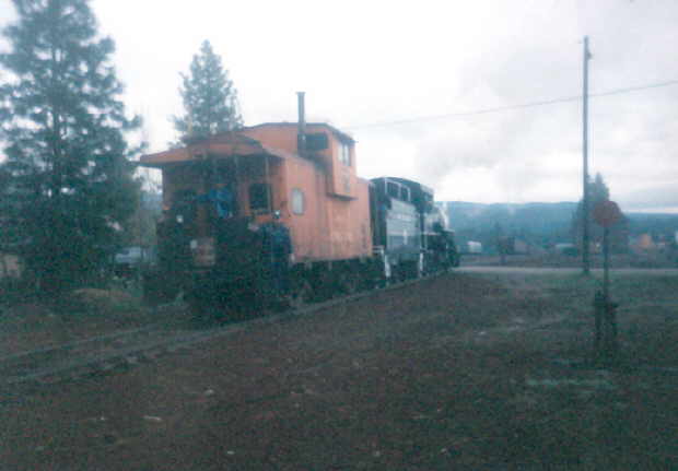 (Picture #111) McCloud, CA, 4/1994. Caption: “The #19 is seen here backing down towards the depot. McCloud Rails pilot engineer Carol Julien is on the caboose steps, and conductor Michael Zetocha is in the caboose door. |
