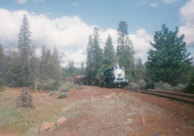 (Picture #113) McCloud, CA, 4/1994. The #19 is whistling for Truck Shop Road and the extreme eastern edge of McCloud. |