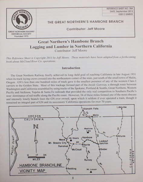 This work also originated in a Yahoo discussion group, in this case a Great Northern list. The subject came up of GN's footprint in California, and the reply I posted sparked a discussion with the Great Northern Railway Historical Society, which quickly turned into this 32-page Reference Sheet on the history of the Hambone to Lookout line. This Reference Sheet is available through the GNRHS as part of a package also including a copy of their magazine, The Goat, Modeler's Pages, and the society's 2014 calendar. GNRHS Store (External Link) |