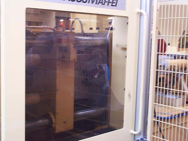 On the other side of this window on the machine, you can see where the mold is placed. The two halves of the mold are pressed together with hydraulics.