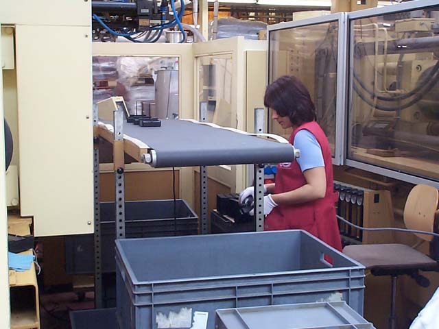 Here is the picture where the robotic arm places the part after it is removed from the injection machine. This lady is using a pair of air-powered snips to take off the extra parts of plastic that are left behind from the injection molding.
