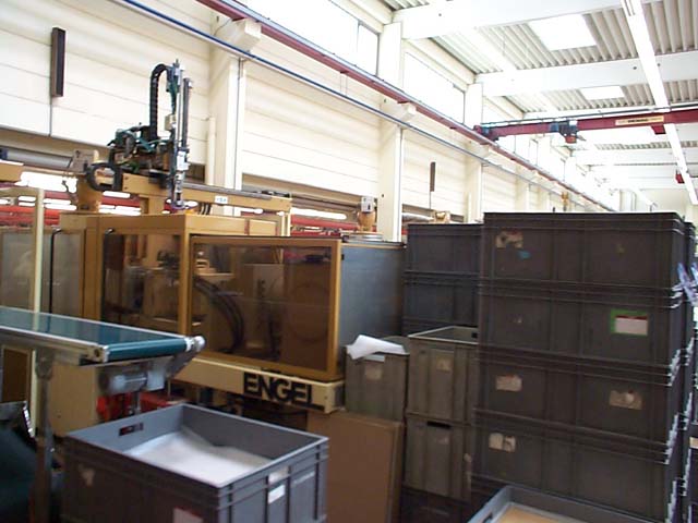 These are the bins that hold the finished parts until assembly. Take notice of the overhead crane that is used to lift the molds into place. Depending on the part, the molds can weigh hundreds of pounds. The molds are machined from solid blocks of metal.