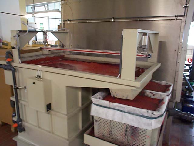 This is the part of the paint booth that removes the excess paint from the water which will get re circulated in the spray booth. The paint floats on the top of the water, so a skimmer runs across the surface of the water and pushes the paint into the trash bags.