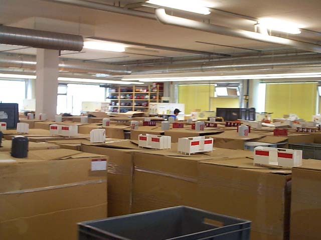 This is the room where the pad printing takes place. This is when all of the lettering is applied to the car. All of these cars are already painted and are waiting to have the lettering put on. Notice that boxcar doors are not applied until the final assembly. Here you can really see that the boxes are distinguished by what is placed on the top. I had to do everything in my power to keep from switching around all of the models.