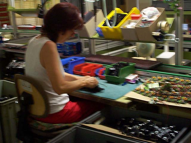 In this step, this lady is adding the circuit boards to the trucks. She also added the base for the car to the moving table. All of these parts will be added to the Arosa control car that we have been seeing produced so far.