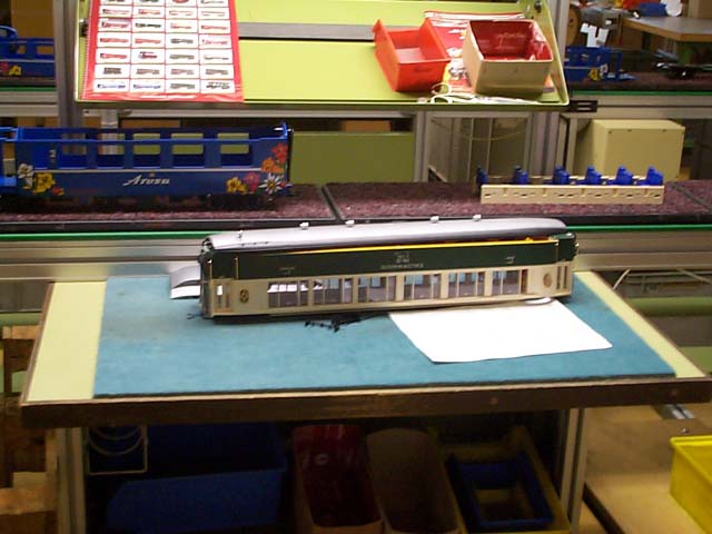 This was another car that they ran out of parts for. It is waiting for the parts to come so they can finish it up. If you look at the shelf in the upper left hand corner there is a book with a bunch of pictures on it. This is so the workers can see what the finished product should look like as they work on it.