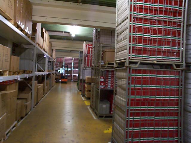 This is just more isles of boxes. We are standing in the middle of this room and the room continues about 100 feet to the left and 30 feet to the right.