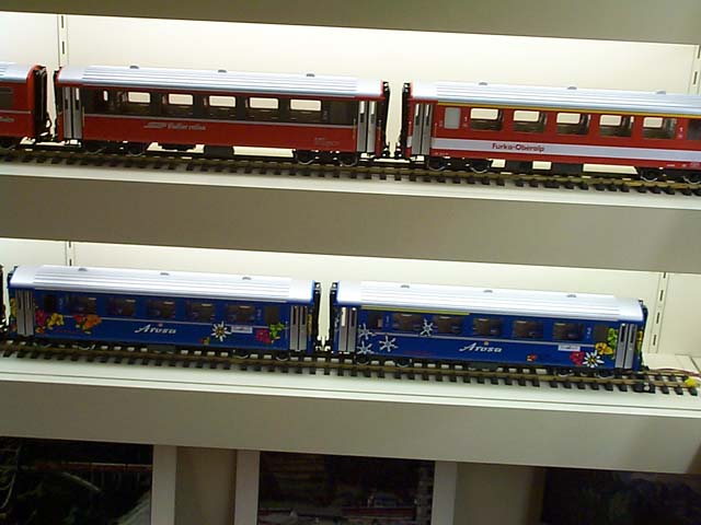 On the other side of the conference room where shelve where they had hundreds of models. The next few pictures are of those. In this picture are the RhB passengers in the standard red paint scheme and then in the Arosa paint scheme.