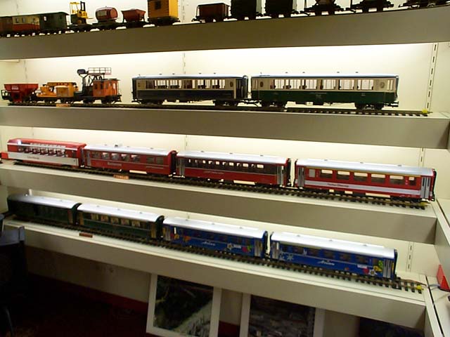 Here are more pictures of the passenger cars. Take note of the panorama car on the left and the limited edition Orient Express coaches on the top shelf.
