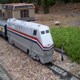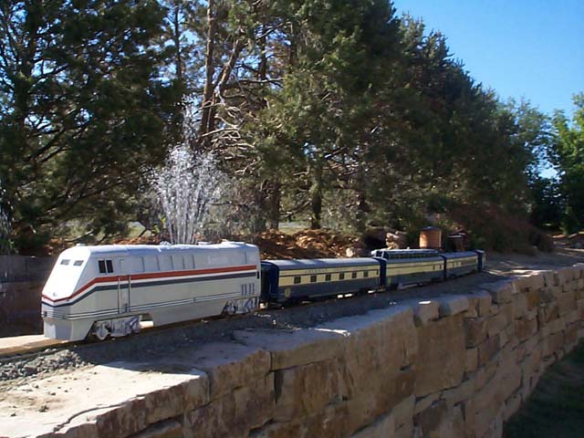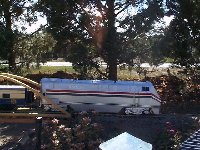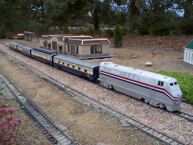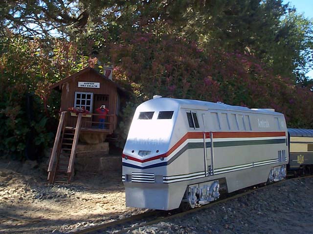 This is a locomotive that that we built to go with our American Orient Express passenger cars. We built it as a P-42. This is because AOE contracts with Amtrak to pull their trains. We built the model with Aristocraft FA motor blocks. We rebuilt the side frames to match the prototype. Each side of the side frame took about 40 pieces to make. The sides of the locomotive are made of sheet styrene. The grates on the side are also plastic. The roof was a hard part to make because of the arch of it and high amount of detail. We found a clay that is made of paper that doesn't need baked in order to get hard, but takes a few hours to get hard. It worked well. To make all of the surfaces the right contour, we used LOTS of BONDO! This locomotive as some very hard angles to model in real life. We did all the lettering on our computer. We ran wide vinyl striping through our laser printer and then cut out the letters with a razor blade. The red, white, and blue stripes ware automotive striping. That is much easier than painting it on. We then added the detail and weight. UPDATE!! This model will someday be replaced by the LGB P- 42. This model will still remain in the rail yard on the layout. |