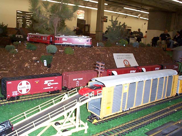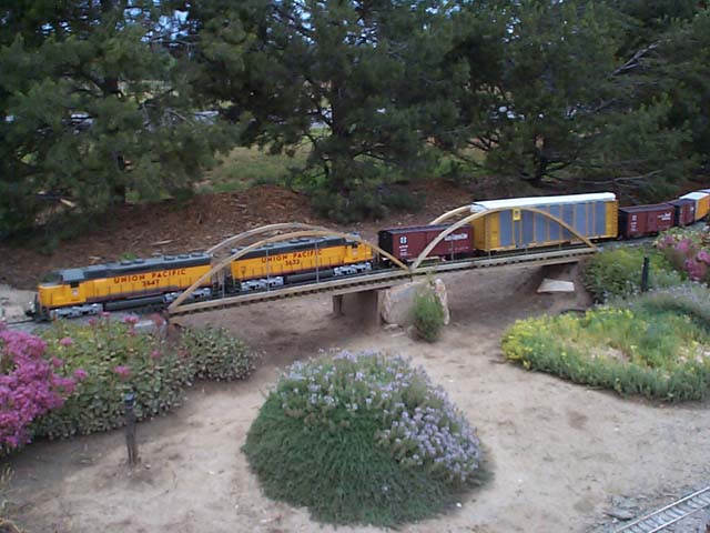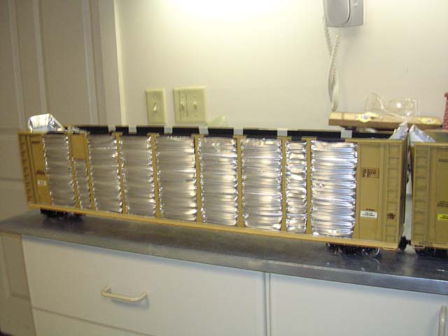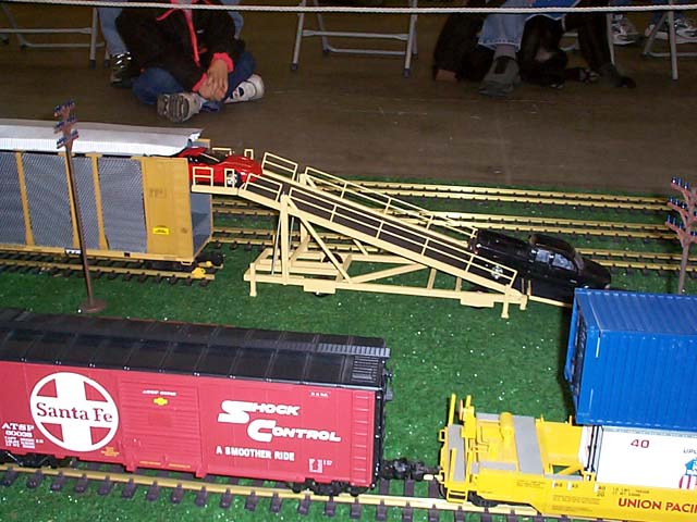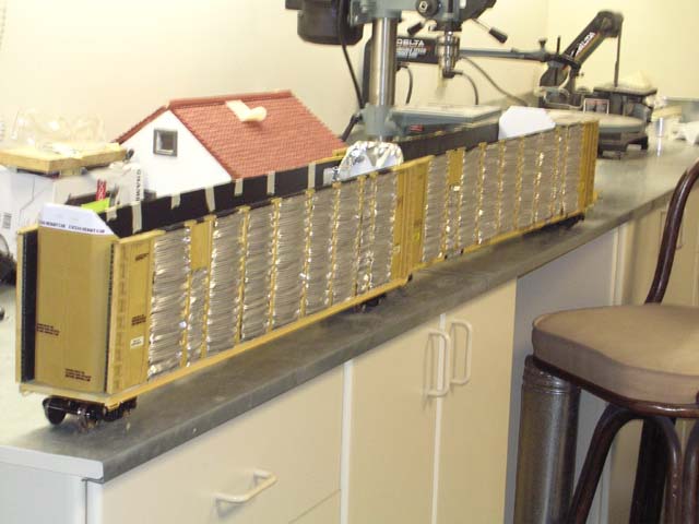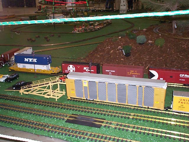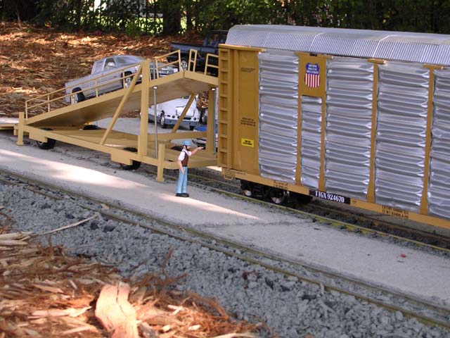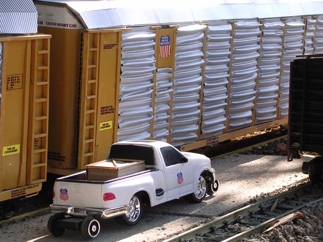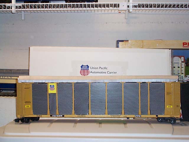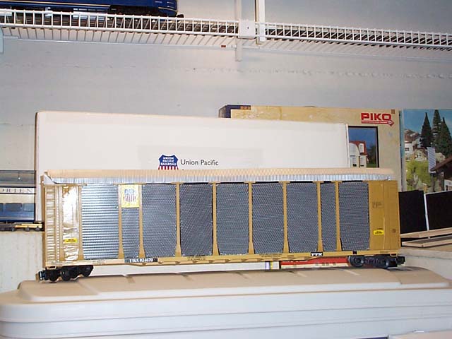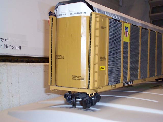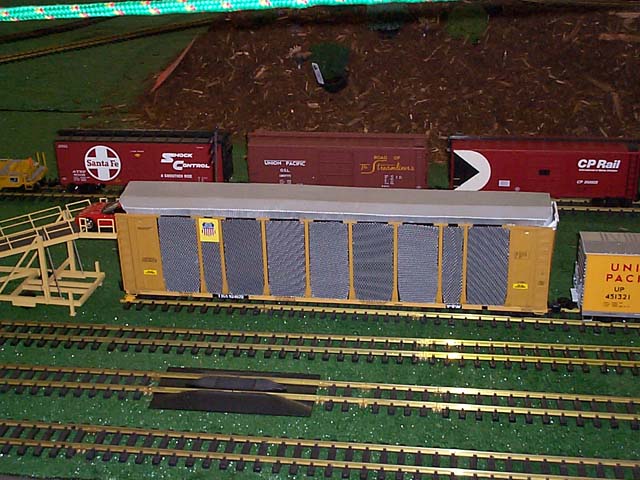Automotive Carriers This is another project that my brother made. He liked the look of these cars, but they were not produced by any largescale manufacturer. He then decided to make them himself. His original plan was to make 3 and give them to me for Christmas. They took forever, and he only got one done in time. He made them out of bass wood over top of plastic sign board. It is the board that political endorsements are put on. The roof and ends were made out of metal. He used tinning foil that he got at Hobby Lobby. To get the rib on it we used a Fiskars paper crimper that we have used on a lot of our projects. He then bent the metal to the way it needed to be on a brake that my dad has at his sheet metal shop. The screens on the side was an open mesh screen also run through the paper crimper. He made all the decals on our computer with inkjet water slide decal film. He is presently building two more of the carriers. He is trying some new things on them, including a new type of grate on the sides. He has also upgraded the old one to match the new ones. He has also changed them over to roller bearing trucks from Aristocraft. I will update this page when the others are done. UPDATE!! 3-1-04 Here is what is new with the auto carriers. My brother has the frame done for 2 more cars. He has also found a new type of metal to put on the sides. It already has the ribbs in it and looks very close to the prototype. He is also putting it on the previous car. He has not finished them yet, but will soon. He is also re-doing the roofs and is supporting them better. Here are the new pictures. UPDATE!! 8-23-04 My brother has completed 3 more auto rack cars for our train layout. He did do some changes to the way they were built this time. For the metal ribs on the side of the cars, he used metal dryer vent. The only difference is that this stuff is made for commercial application. We used size 14 inch because the roudness is not as much and it can be bent out without making creases in the ribs. For the roof, he used precision plastic sheets as the tinning foil is too fragile to cary to train shows. He decided to make 2 of them Union Pacific and 1 BNSF. Here are some pictures below of the final product. You can see more pictures of them under the Summer 2004 section on the main page. |